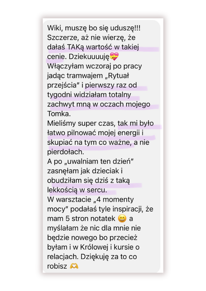 Ten kurs jest jak powiedzenie samej sobie: Wybieram Siebie. I to Siebie w swoim blasku, przyjemności i dobrostanie. Lekkość też jest dla mnie. Mogę po kobiecemu. Już teraz.