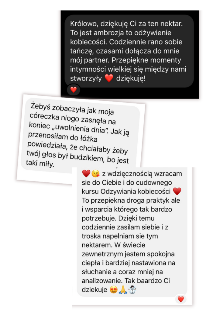 A to dopiero… początek! Oprócz tego w bonusie otrzymujesz dostęp do 14 PRAKTYK/RYTUAŁÓW – NIESPODZIANEK. Kilka mogę zdradzić: Afirmacje dla Twojej kobiecości, Rozświetlona od Wewnątrz, Dzień w karmiącym przyjmowaniu, Ukojenie głowy i układu nerwowego, Energetyczny Masaż Piersi, Oddaj ciężary – Twoja oda do lekkości… reszta niech pozostanie naszą słodką tajemnicą.